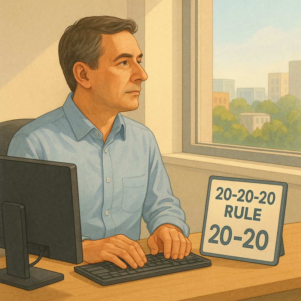- 20-20-20 규칙: 20분마다, 20피트(약 6미터) 떨어진 곳을 20초간 바라보는 습관을 들이세요.
